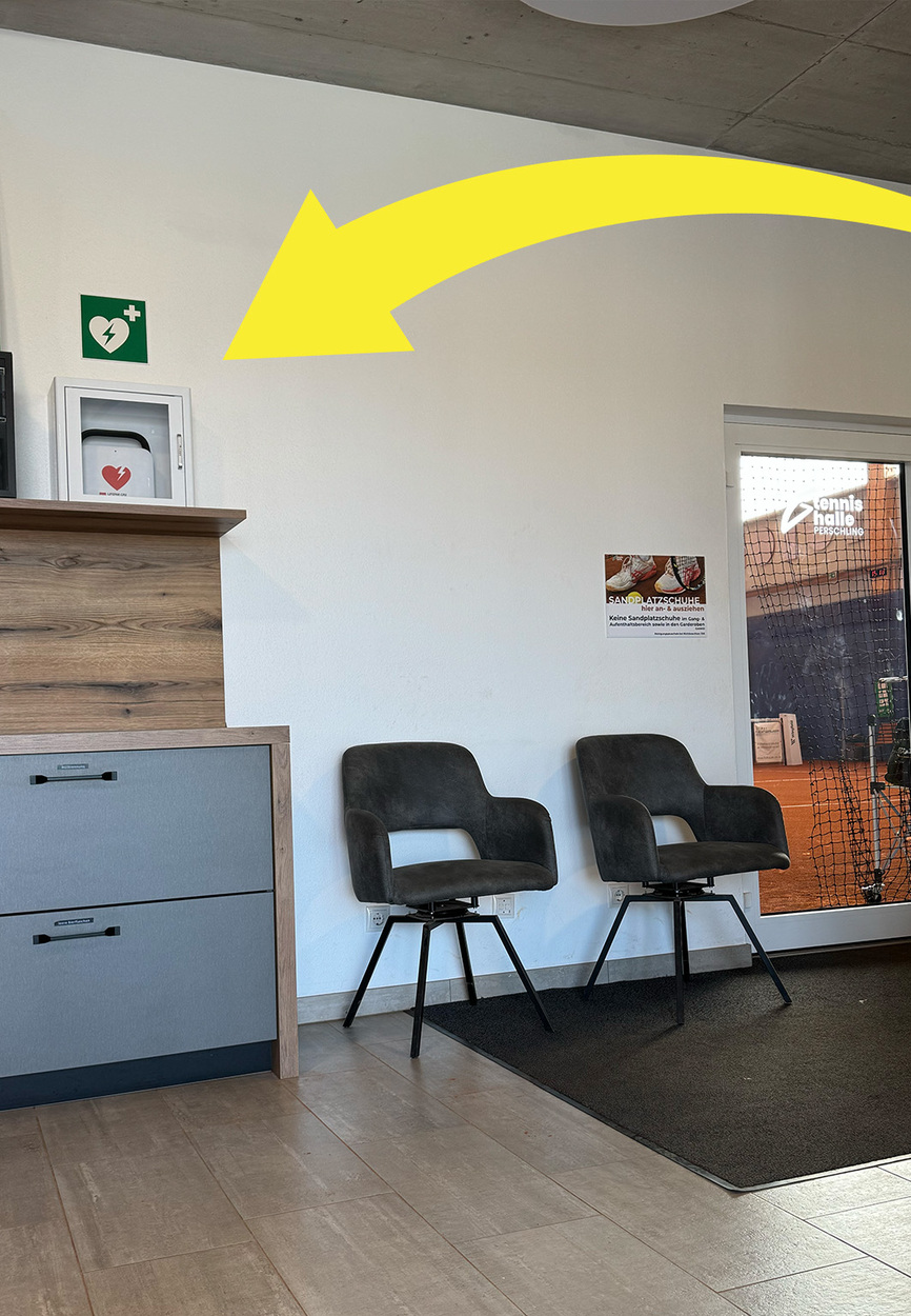 Der Defibrillator befindet sich im Eingangsbereich gleich neben dem Eingang zu den Tennisplätzen und ist im Notfall schnell erreichbar.
